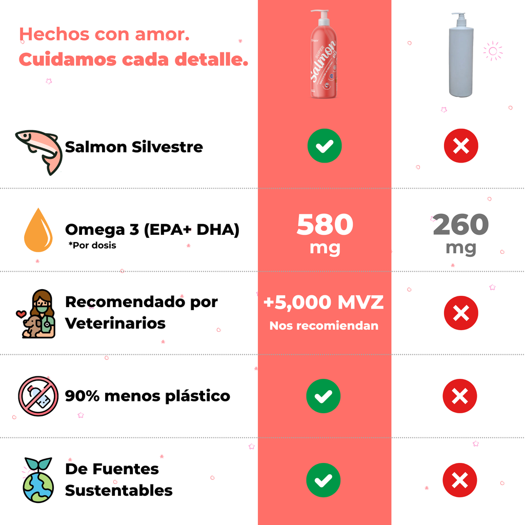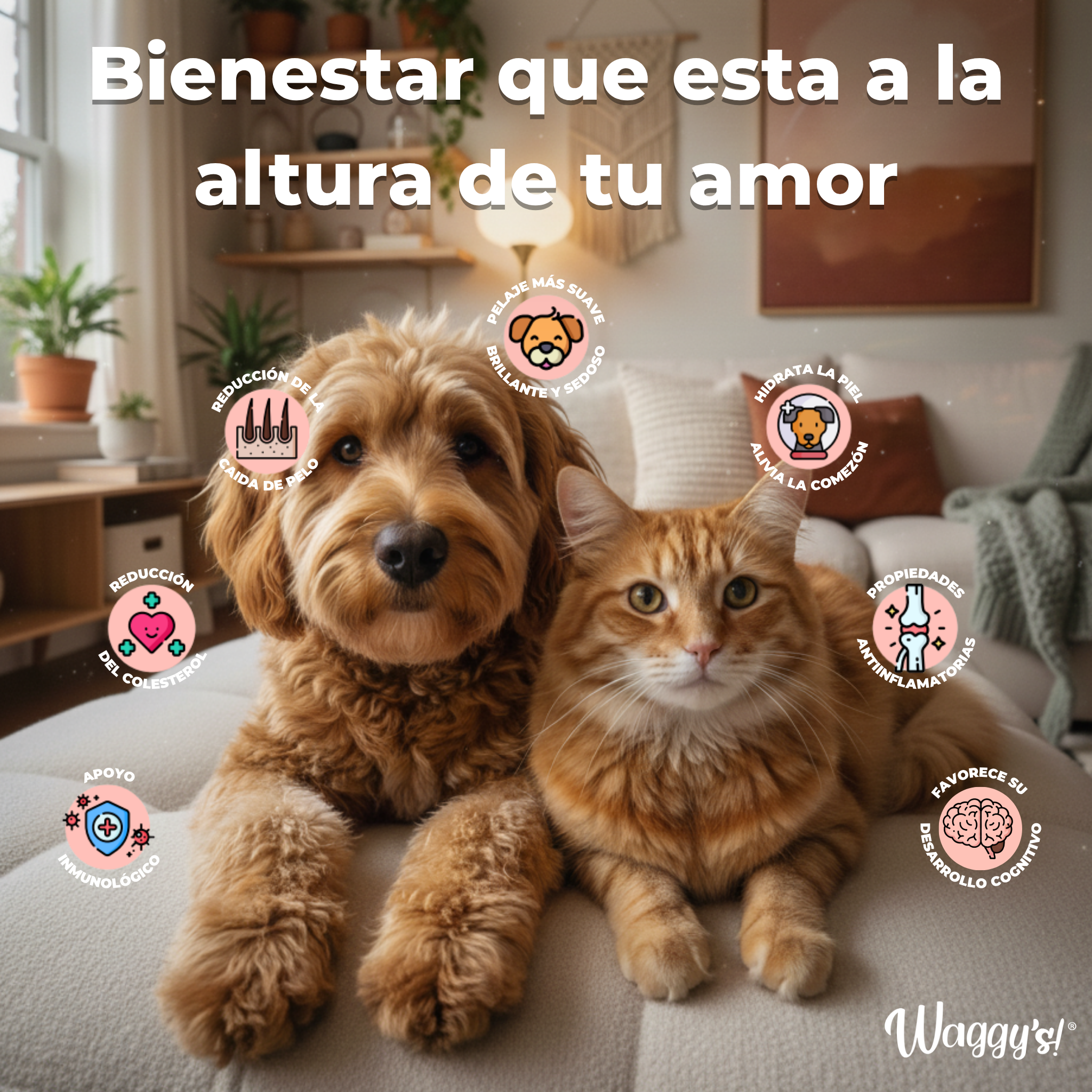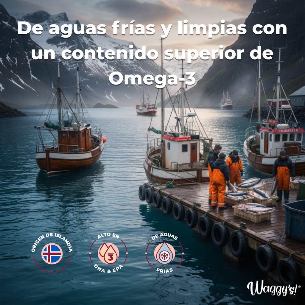 El Super Salmon Oil de Waggys es un suplemento natural diseñado para mejorar la salud de la piel y el brillo del pelaje de tu perro desde adentro. Elaborado con salmón de alta calidad, es una fuente superior de Omega 3 y 6, esenciales para mantener un pelaje suave, una piel hidratada y un bienestar integral.