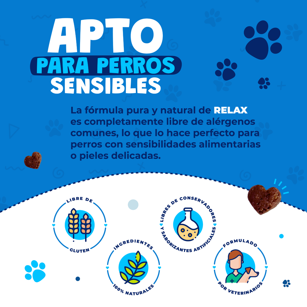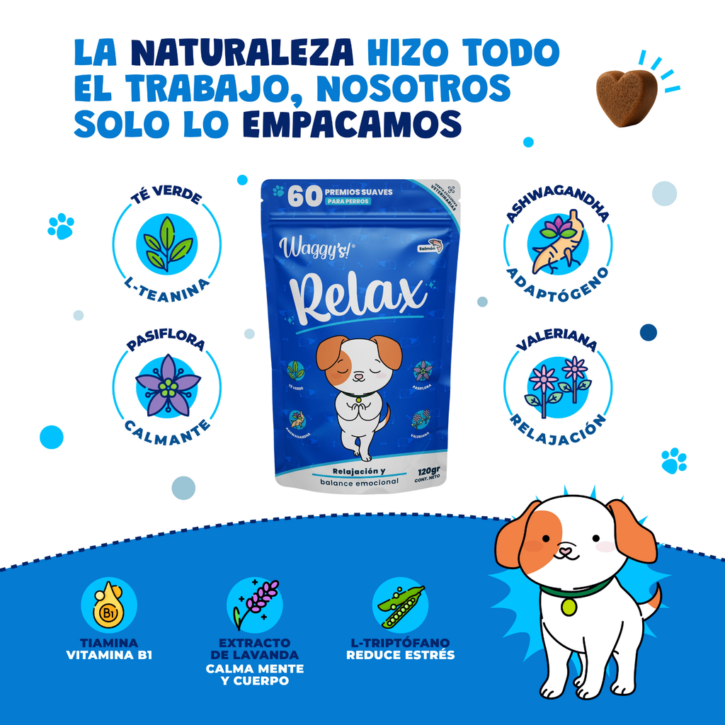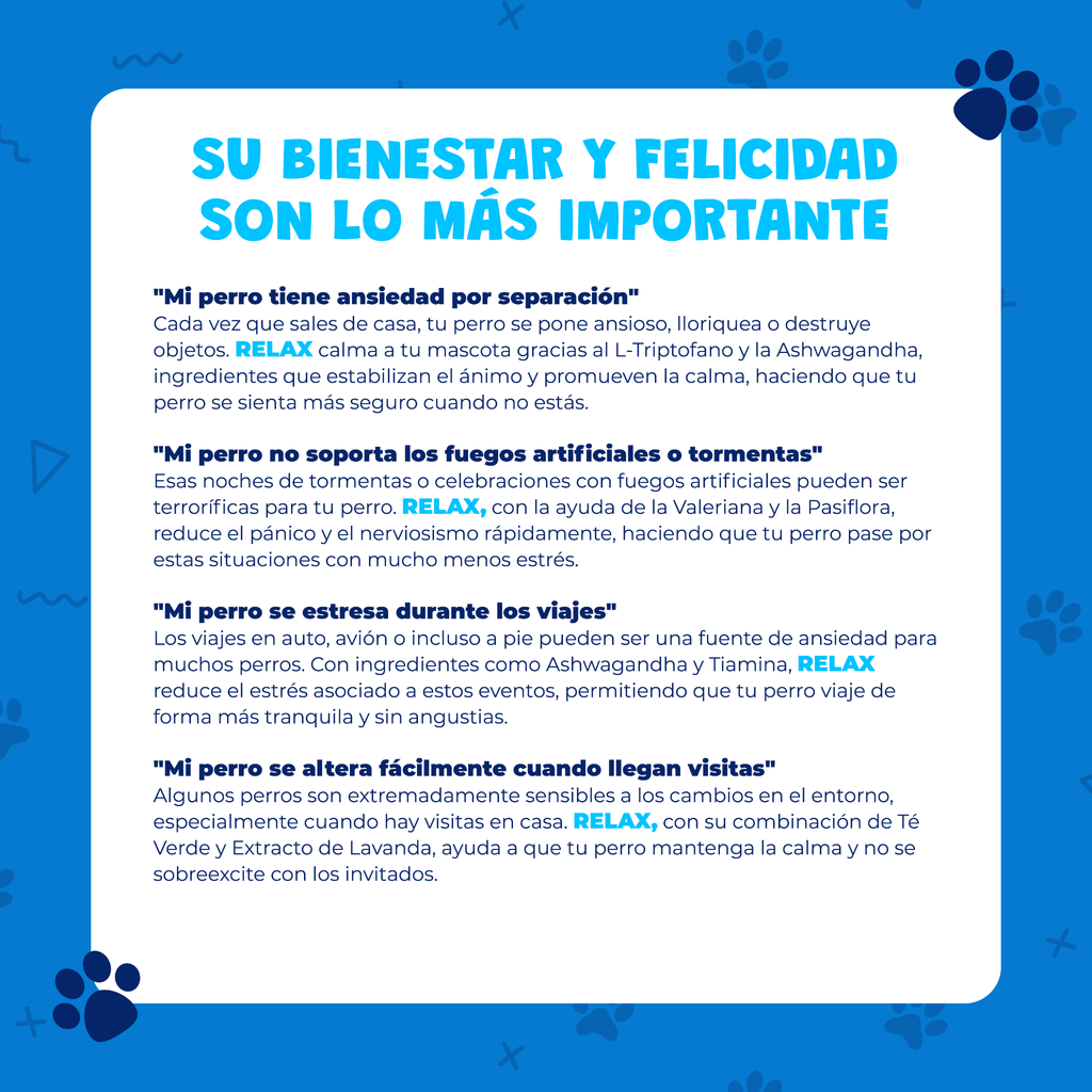 RELAX is the natural solution that helps calm your pet in stressful situations without causing drowsiness. Formulated with 100% natural ingredients such as Green Tea, Ashwagandha, Valerian, and L-Tryptophan, RELAX safely reduces nervousness and promotes calm. Whether during storms, fireworks, trips, or visits to the vet, RELAX keeps your dog calm and relaxed.
